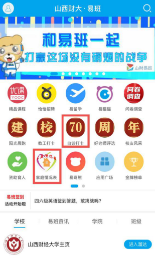 山财易班的“自诊打卡”,要求全校每一位学生根据疫情防控需要,请2021级全体新生按照《2021必威西汉姆联易班邀请函》要求进行注册,并从8月25日开始在家每天11:30前点击“新生打卡”完成每天的健康打卡,为防疫工作添砖加瓦少不了你的加入!